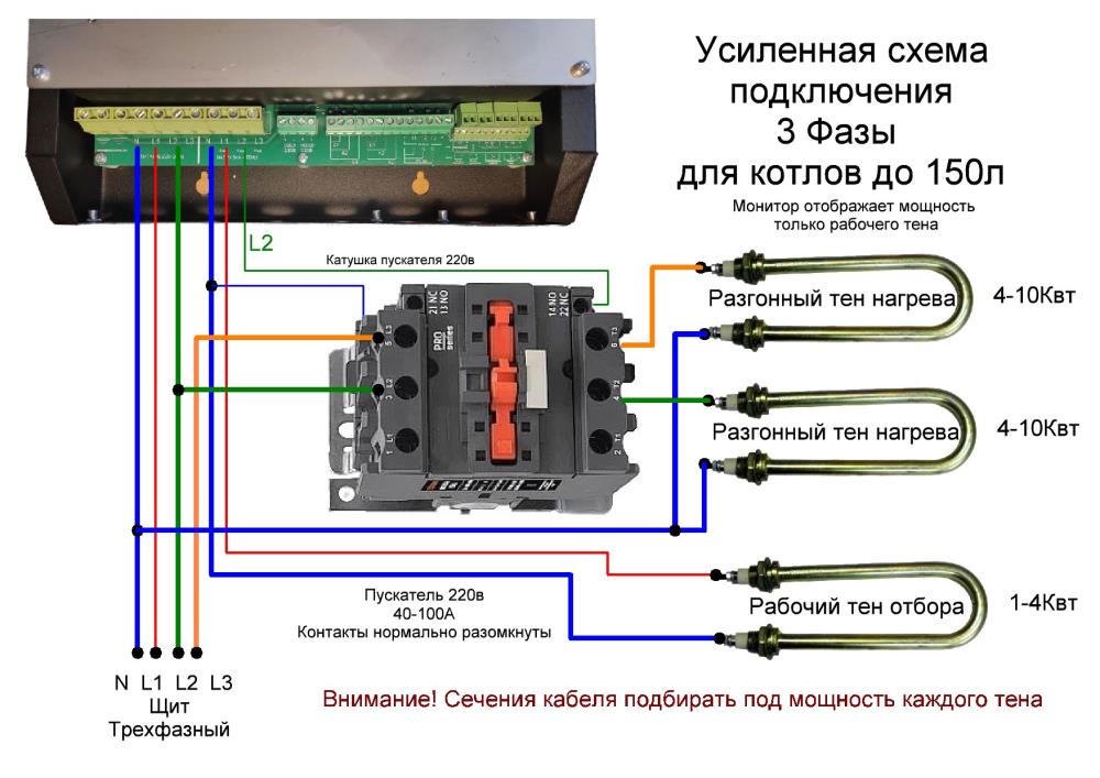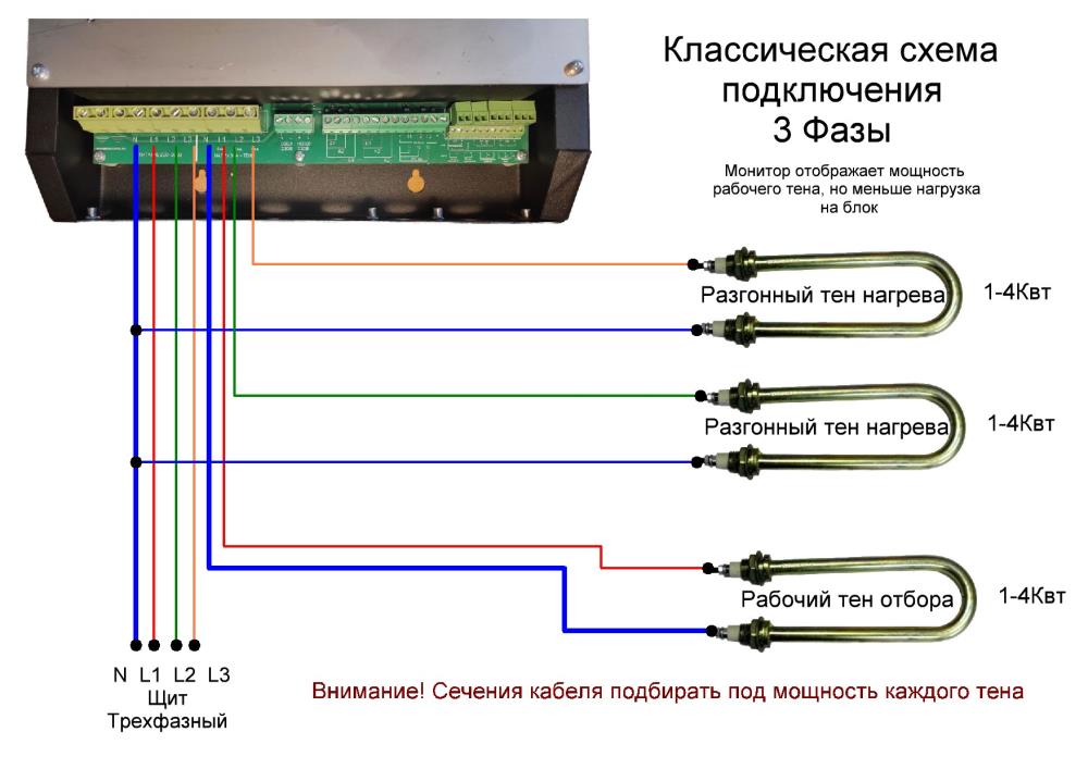 • 1,2,3х фазное подключение. Можно управлять тремя тенами или использовать трехфазный тен.